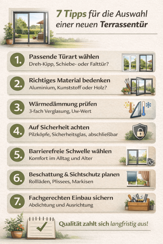 Eine neue Terrassentür ist eine Investition in Wohnqualität, Energieeffizienz und Gartenfreude. Nehmen Sie sich Zeit für die Auswahl, vergleichen Sie Angebote und denken Sie nicht nur an den Preis, sondern auch an Komfort, Sicherheit und Alltagstauglichkeit.