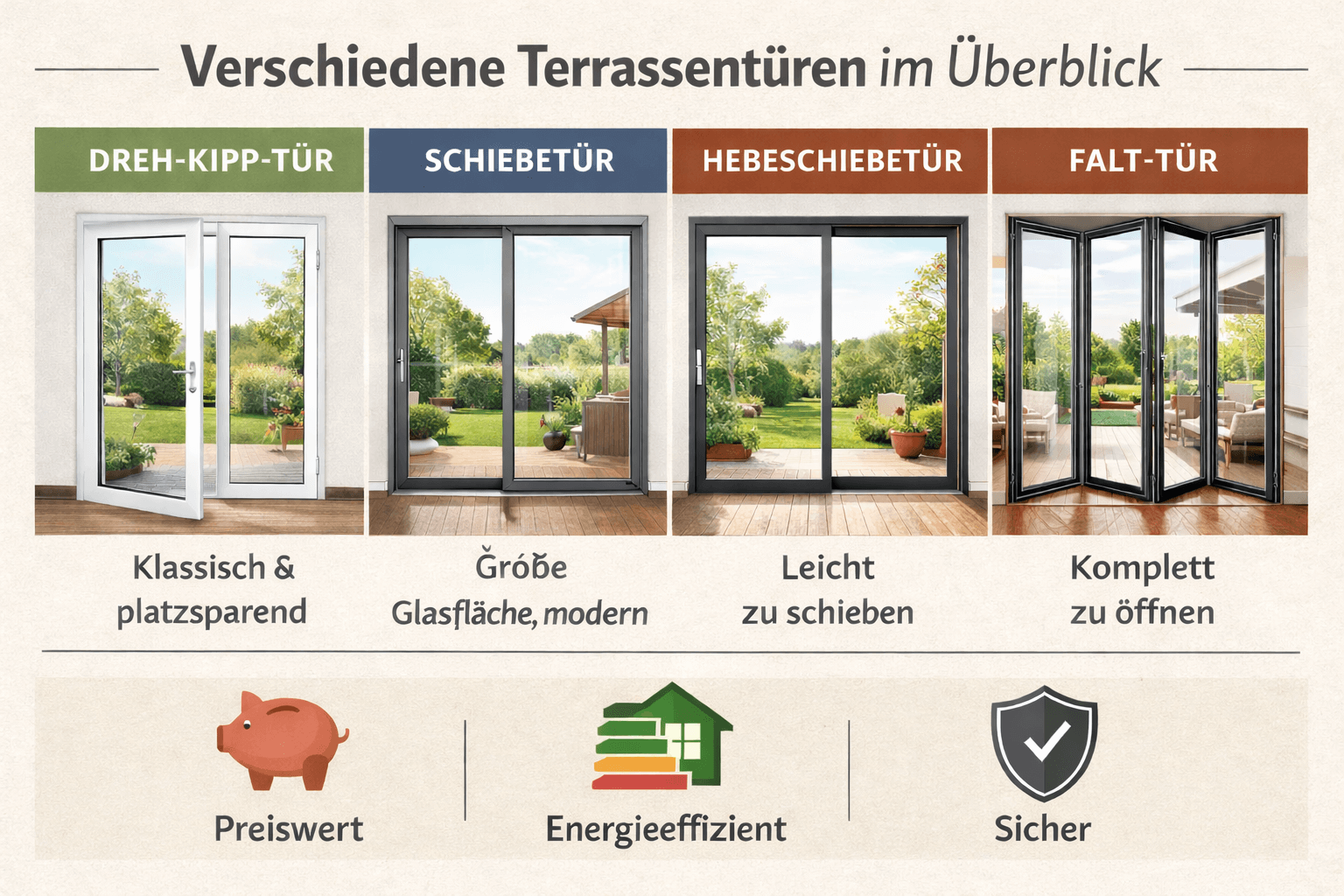Nicht jede Terrassentür passt zu jedem Haus oder Garten. Die gängigsten Varianten sind: